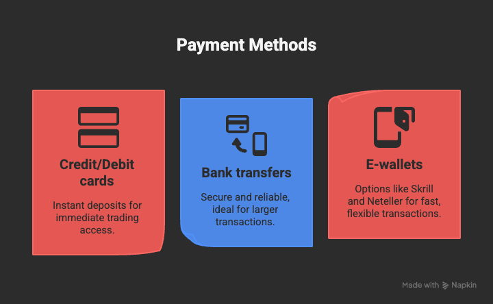 - Credit/Debit cards – Instant deposits for immediate trading access.